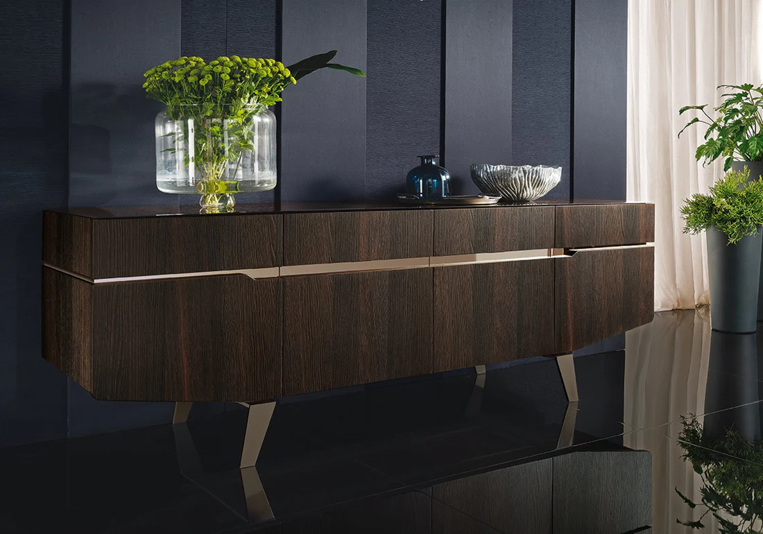 Coffee-tinted walnut meets metal in a rose gold finish in this collection made up of bed, dresser, bedside tables, drawer unit, mirror, vanity unit and…