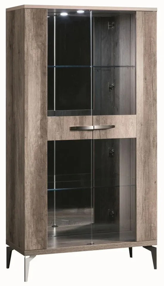 Rustic ecowood finished with a high gloss lacquer, featuring a textured top and metal accents. Includes: Credenza Dining Table Side Chair Curio Cabinet Dining Table…